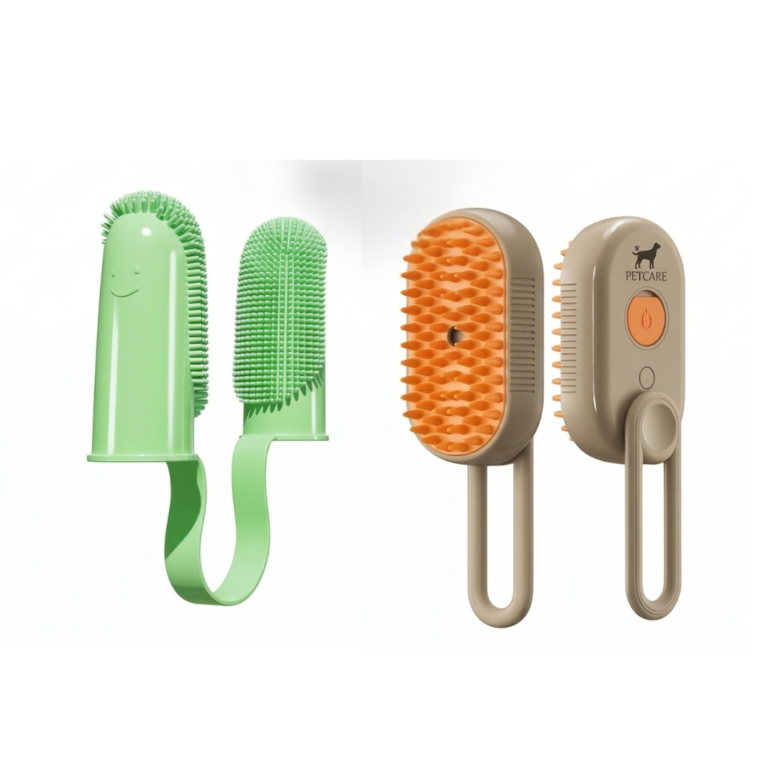 Un ritual de cuidado clínico desde la comodidad de tu hogar. Este dúo de higiene profunda utiliza el poder del Cepillo a vapor para relajar y limpiar el pelaje de tu mascota, eliminando el pelo muerto sin tirones, junto al dedal de silicona médica para una limpieza dental precisa y afectuosa. Invertir en su salud preventiva hoy es garantizarle una vida libre de molestias y ahorrar en futuras visitas al veterinario.